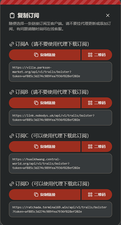 比如 SSRDOG 机场订阅链接如下格式:https://no1-svip.urlapi-dodo.sbs/s?t=